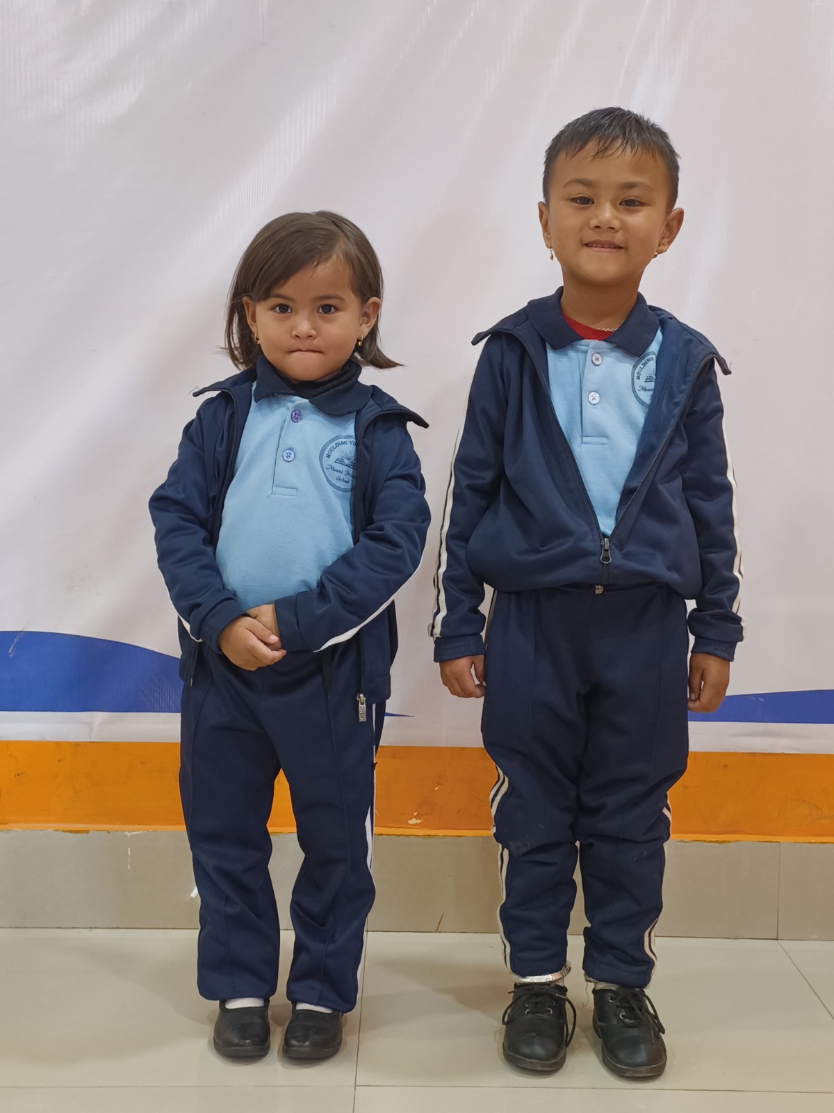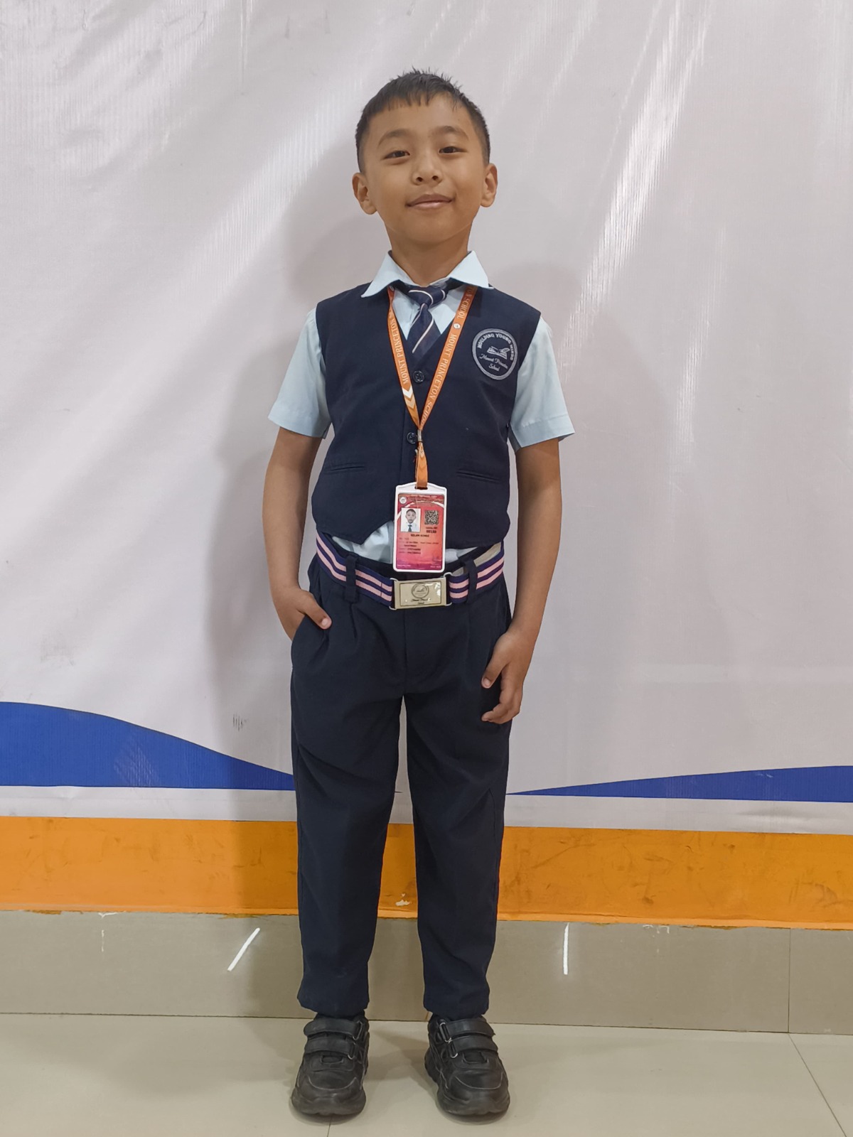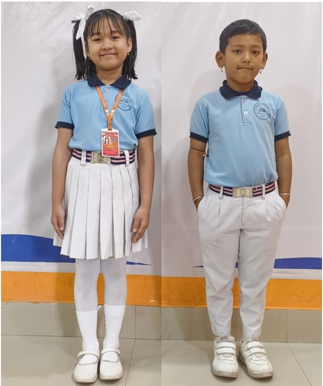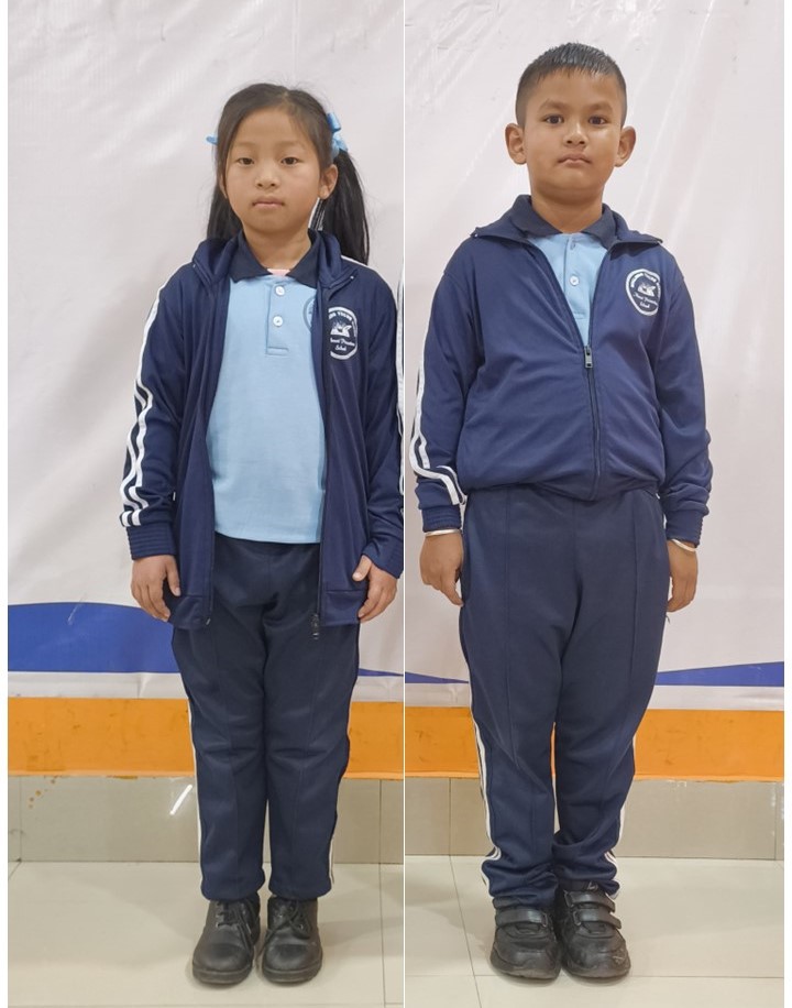 School Uniform SCHOOL UNIFORM Class : Playgroup – UKG Monday- ThursdayGirls: Blue T-shirt & blue-black skirt. Monday - ThursdayBoys: Blue T-shirt & blue-black short pant. Friday- SaturdayBoys & Girls: Blue T-shirt & Track pant Class : I – V Monday- TuesdayGirls: Blue collared shirt, school tie, blue-black skirt, light blue ribbon, school belt, blue-black vest, black socks, black shoes. Monday- TuesdayBoys : Blue collared shirt, school tie, blue-black trouser, school belt, blue-black vest, black socks, black shoes. Wednesday-ThursdayGirls: Blue T-shirt, white skirt, white socks, white shoes. Boys: Blue T-shirt, white trouser, white socks, white shoes. Friday - Saturday Boys & Girls Track suit, T-shirt, black socks, black shoes.